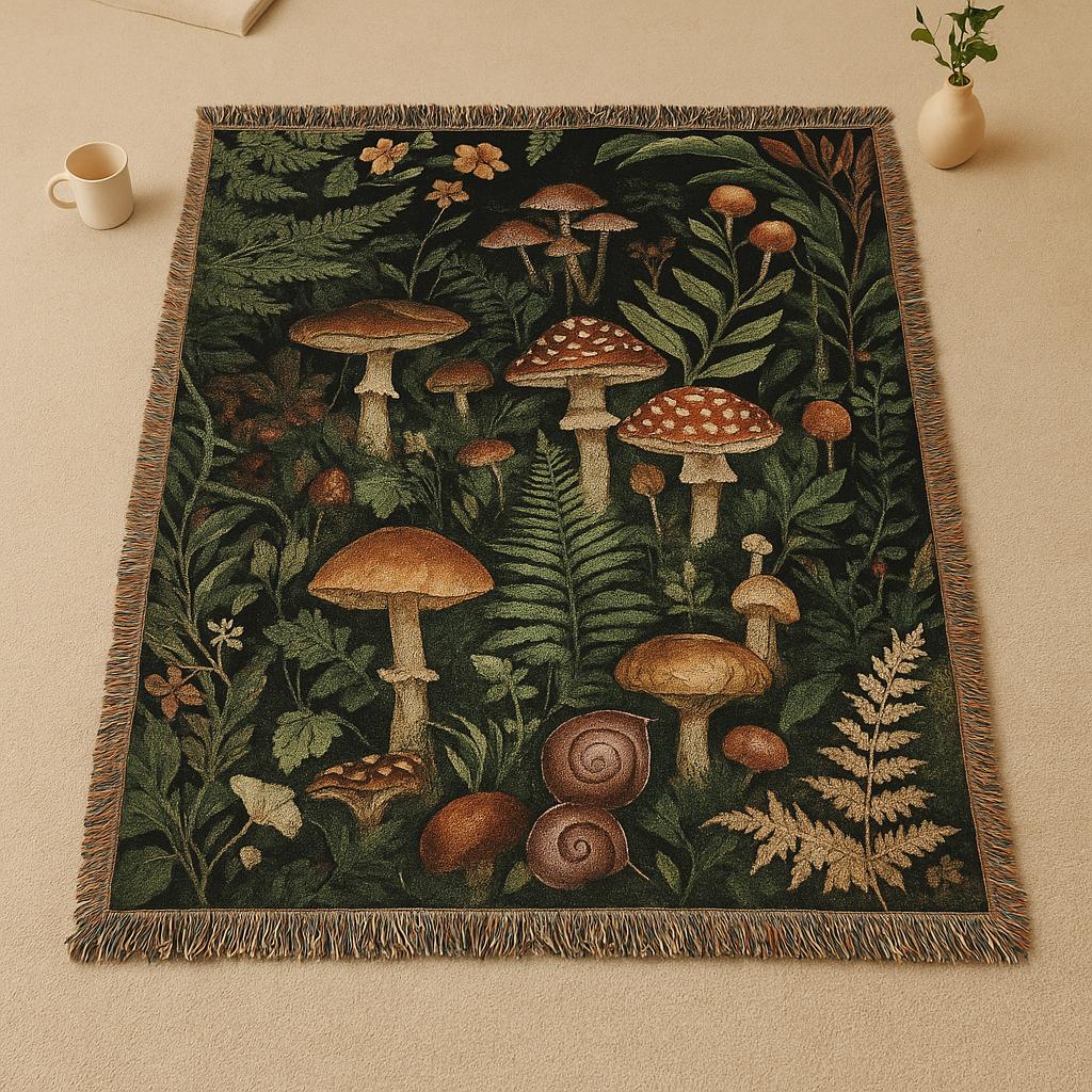 ✨ Description Bring the calm spirit of nature into your home with this Botanical Mushroom Woven Blanket, where forest art meets comfort. Crafted from 100% natural cotton, it features dark botanical patterns — mushrooms, ferns, and earthy tones woven into harmony. This premium throw adds warmth, depth, and natural elegance to any space, from cozy living rooms to creative bedrooms.